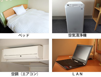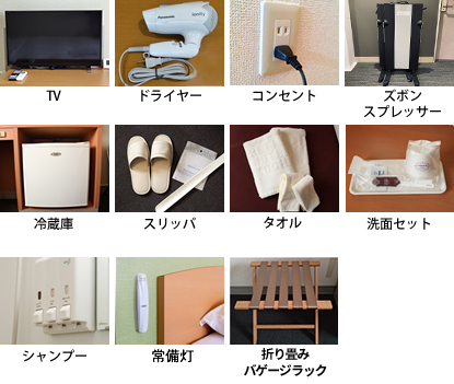 空気清浄器/ドライヤー600w/ 光LAN(デュアル端子)/エアコン/シャワートイレ/液晶TV/ 冷蔵庫/グラス/給湯ポット/コンセント(3口)/ シャンプー/リンス/ボディーソープ/歯ブラシセット/髭剃り/スリッパ/使い捨てスリッパ/お茶/バスタオル・フェイスタオル/常備灯/折り畳みバゲージラック